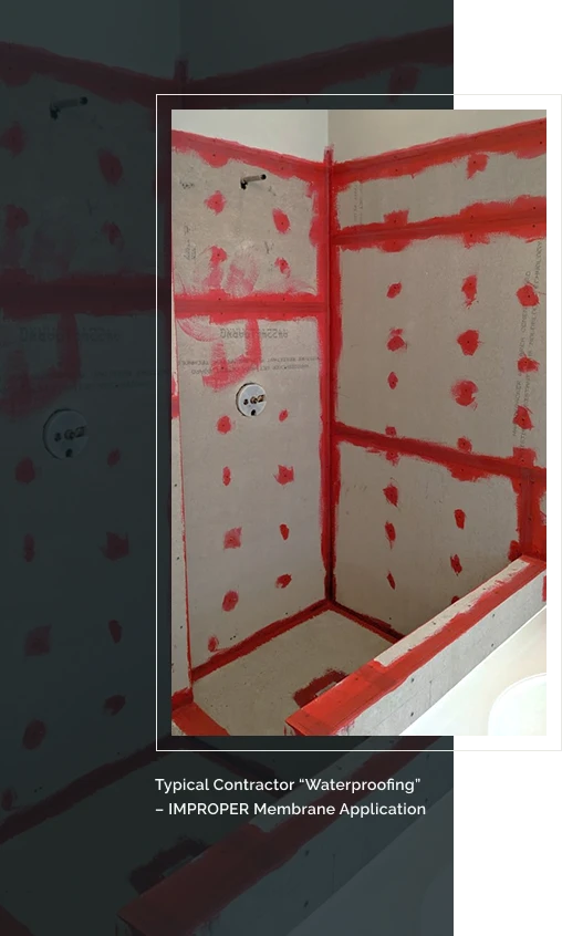 By far, the worst problems with typical Houston showers are in their waterproofing, as in the picture to the right. If your contractor says this is “waterproof,” STOP him in his tracks and fire him immediately! He doesn’t understand how waterproofing works.