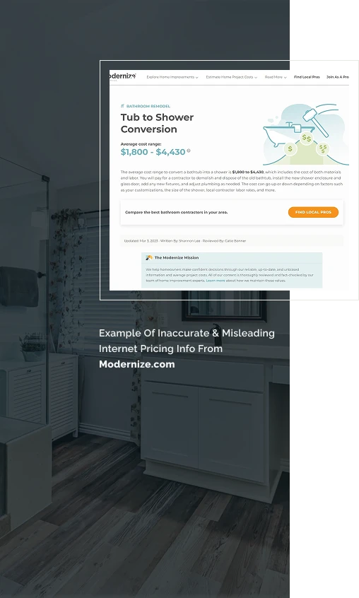 Modernize is telling you that a tub-to-shower conversion can be had for $1,800, via Shannon (the author) and Catie (the reviewer). No offense guys, but what do a couple of bloggers know about what a tub-to-shower conversion costs? The truth is, they don’t have a clue.